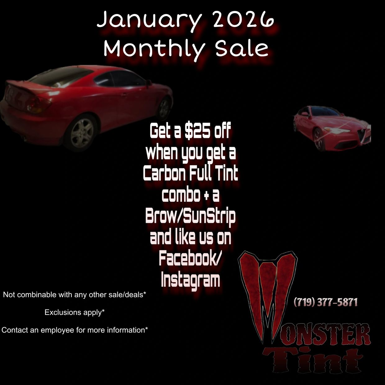 January sale only applicable January 1st 2026 - January 31st 2026. Not combinable with any other sale or offers. Exclusions apply. Contact an employee for more details